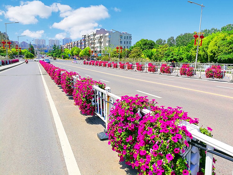 武汉城市道路马鞍式立体花盆工程案例:护栏绿化快速成景实拍